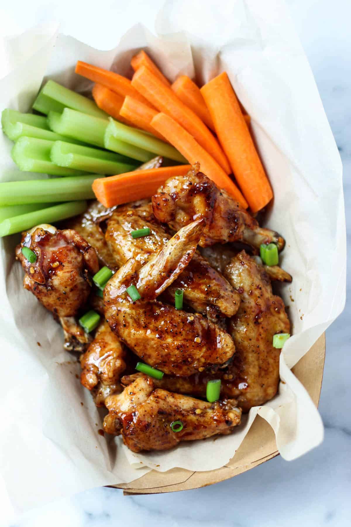 - Once wings are done, add to a large bowl. Cover with sauce and toss to coat. Sprinkle with sliced green onions and serve with carrots and celery.