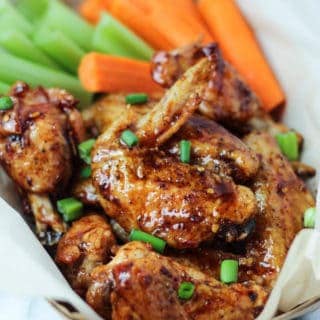 These wings are baked at a high temp to get them crispy without any added flour. The sauce is made on the stovetop while the wings cook and simmers until it thickens up. You then just toss the wings with the sauce and they are ready to eat! Serve them with some celery and carrots and you have yourself a party!