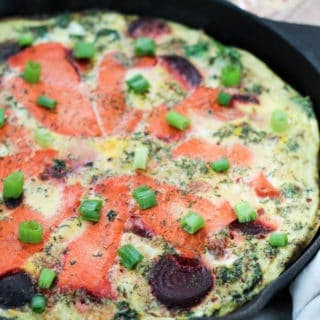And that’s how this beet & smoked salmon frittata was born. Pretty much me just combining some of my favorite foods into one, like most of my recipes haha. This frittata only calls for one pan and can be made in under 30 minutes. It makes for the perfect Sunday brunch, but also keeps great for the week for an easy on-the-go option for the morning. Meal prep that guy on Sunday and you are set for the week. It also makes one pretty plate of food if I do say so myself 🙂