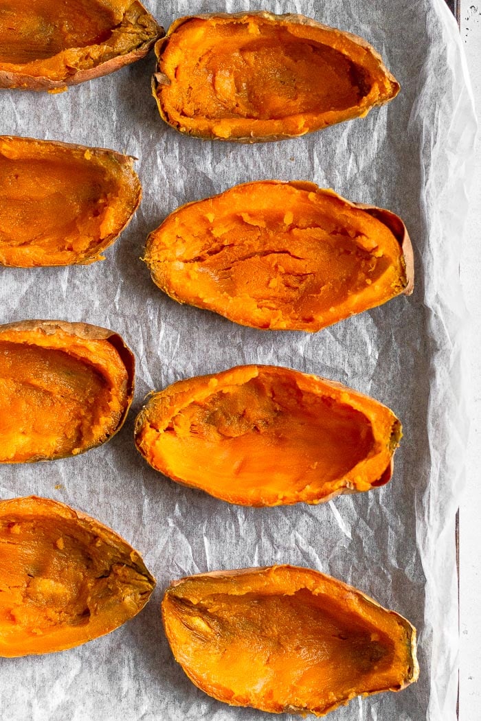 Overhead shot of twice baked sweet potatoes on a baking sheet.