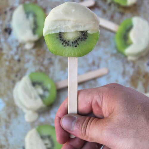 - Line a baking sheet with parchment paper. Cut a small slit on the side of the kiwi and insert a popsicle stick into the slit. Place on the baking sheet and freeze for 30 minutes.