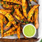Perfectly crispy on the outside and soft in the middle grilled sweet potato fries with a fresh parsley tahini sauce make the perfect easy and healthy summer side. Paleo, vegan, and Whole30 approved!