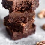 Easy & healthy no-bake walnut protein brownies made with dates, walnuts, protein powder, & cacao with a simple chocolate protein frosting. Vegan, gluten-free, & dairy-free!