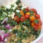 I paired the tomatoes with quinoa for some plant based protein, cucumbers and red onion for some crunch, and goat cheese for some creaminess. I don’t do dairy that often, but goat cheese doesn’t seem to affect my stomach. And goat cheese is legit the best and you can’t go wrong with adding it just about anything.
