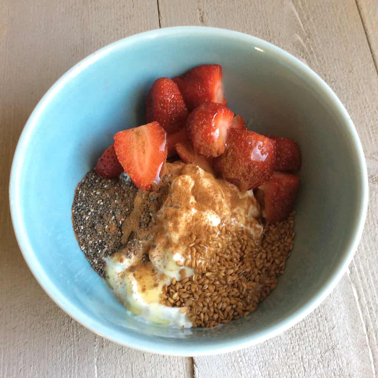 Breakfast was some Greek yogurt, chia seeds, flax seeds, and fresh strawberries all topped with local honey and cinnamon. I read from another blogger that your body can’t digest the whole flax seed and you should buy them ground. I need to look into that as I usually eat them whole.