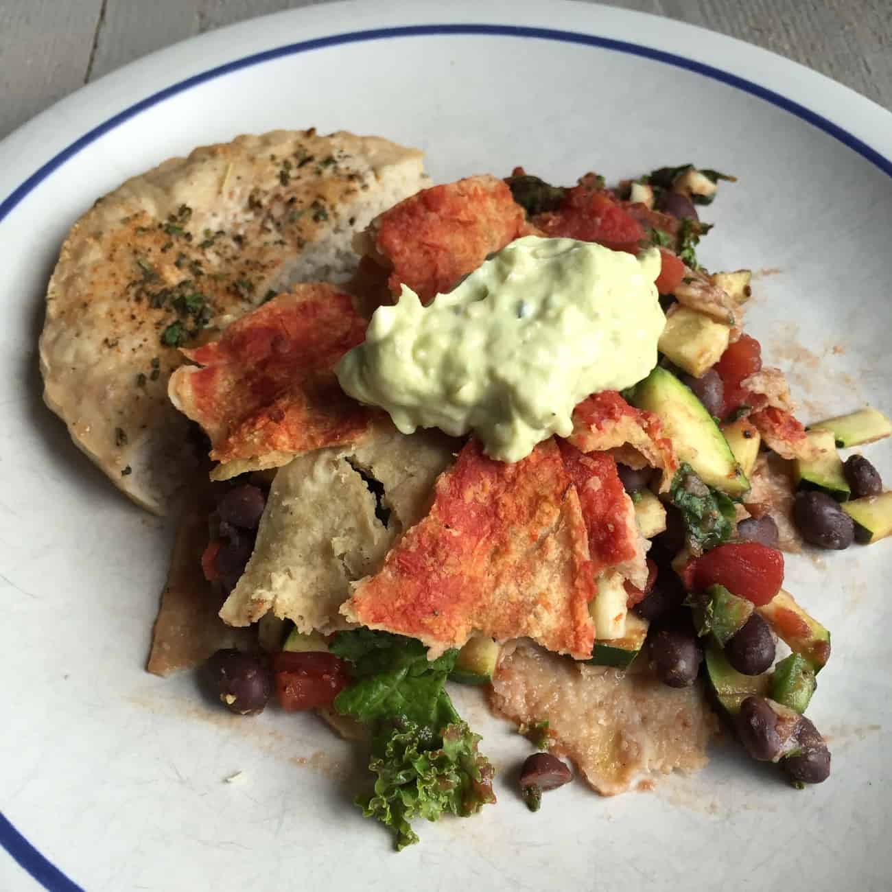 By dinner I was literally starving. I meant to have a snack in the afternoon, but got too caught up with work and then realized it was almost 5 and didn’t want to eat that close to dinner. I just winged it for dinner and made a casserole type thing with corn tortillas, black beans, tomatoes, kale, zucchini, and jalapenos. I topped it with some avocado and Greek yogurt sauce. I was so hungry that I had another piece of that and a half of a turkey burger since the bf had made some for himself. The casserole didn’t hold together that well and looks like a hot mess.