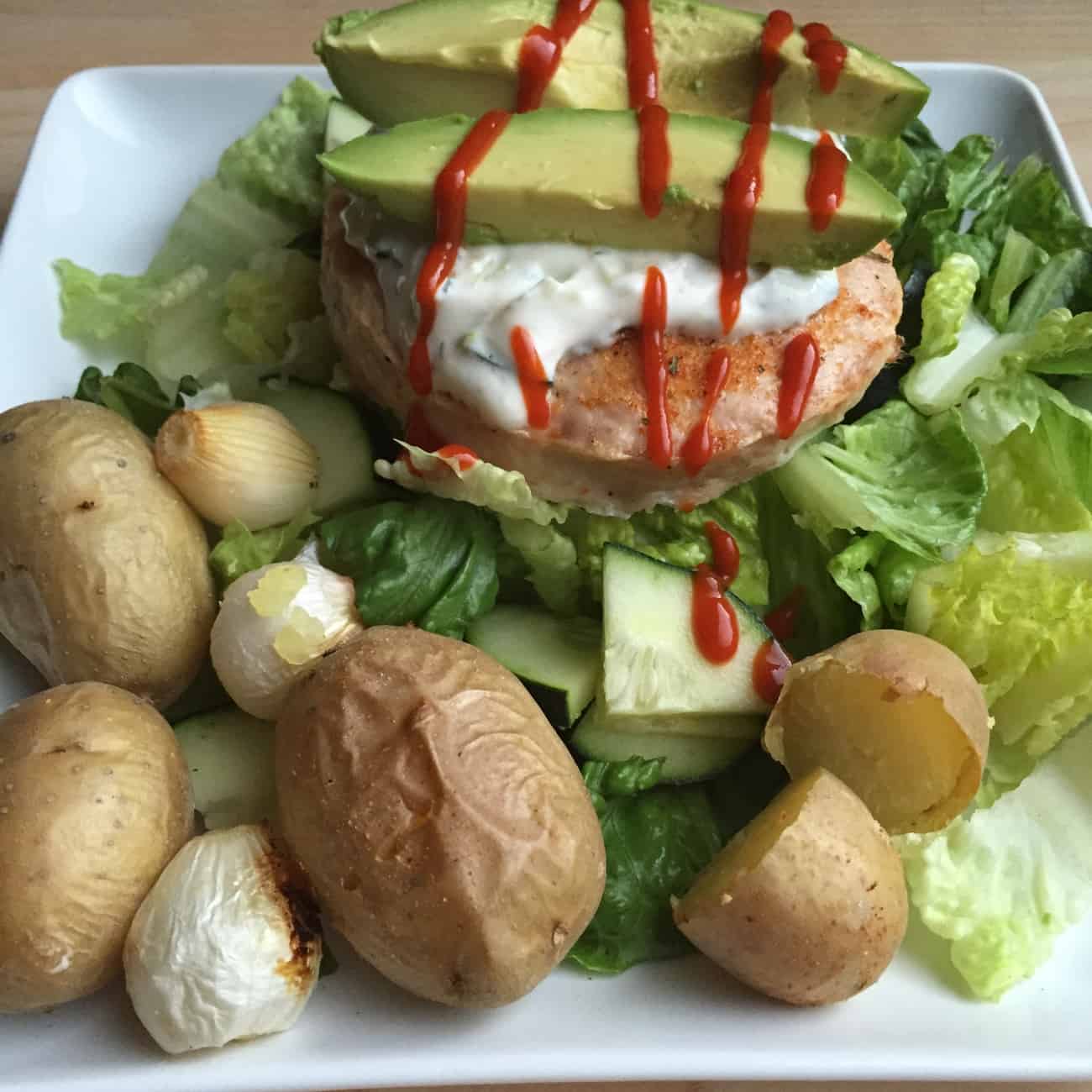 We started to get dinner ready and just settled on Turkey burgers (from Costco), roasted potatoes and onions, avocado, and a quick tzatziki sauce I whipped up. I had it all on some lettuce to help get rid of some of the veggies we have before we leave town for a week.