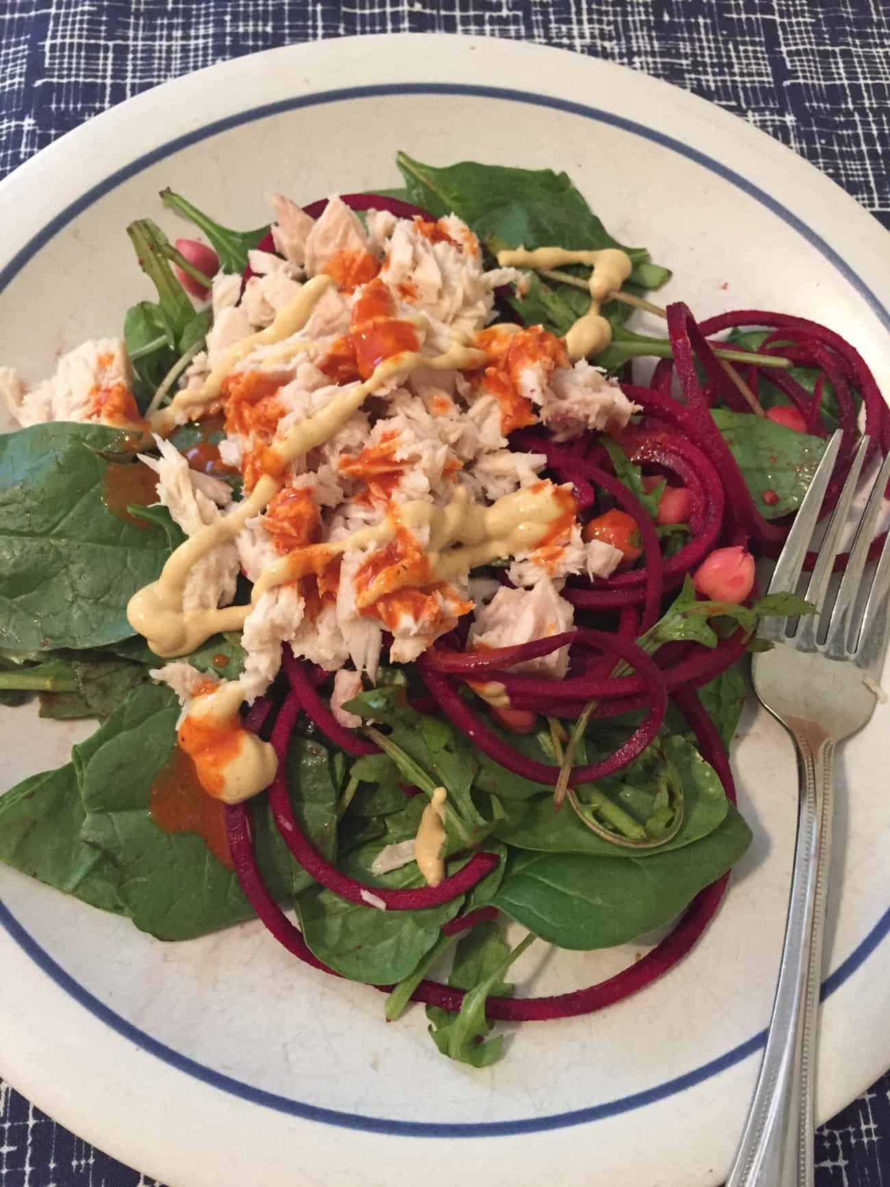 Two hours later I was hungry again so I had more leftover salad and added some canned tuna with some mustard and hot sauce. Pre-dinner snack was two pickles. I ate one and then wanted another. They are the best. Ignore my chewed up cuticles, I have a slight problem with that.